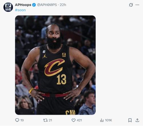 不过快船媒体APHOOPS晒出了一张哈登骑士球衣的照片写道:SOON!(很快、立马)