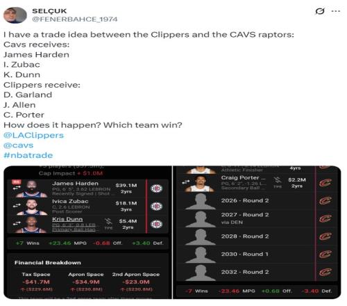 曝哈登陷交易流言!船媒晒骑士球衣照美球迷模拟8换3两队改阵容
